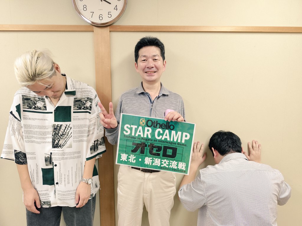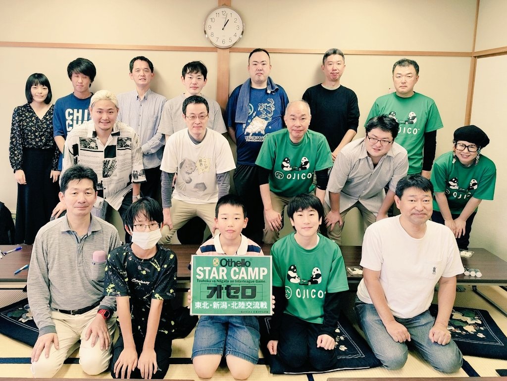 STAR CAMP SPECIAL 2025 2025/10/12 新潟市万代市民会館4階405,406号室 20分持ち6回戦 秒ヨミ無し 引分有り 東北チーム(大清水、佐藤、田丸、葛原、庄子) 新潟チーム(滝沢、長尾、梅沢、佐治、藍原、出崎、河野) 北陸チーム(塚本、濱元、橋本、中川) 段級位順、年齢順、敬称略 ※1 常に東北チーム対新潟チーム、東北チーム対北陸チーム、新潟チーム対北陸チームとなるように組み合わせ ※2 但し、葛原三段に限り世界戦の壮行会を兼ねているため、新潟・北陸の日本オセロ連盟レーティング上位選手と対戦団体戦 ※各チーム上位3名の勝数合計 1. 新潟 13.5勝 2. 東北 11勝 3. 北陸 10.5勝 個人戦 1. 滝沢 雅樹 滝雅 ○+48 ○+12 ×- 8 ○+30 ○+14 ○+40 5勝 1敗 0分 ←新潟① 新潟 九段 田丸 大清 塚本 庄子 葛誠 濱元 +136 2. 佐治 亨哉 佐治 △ 0 ○+40 ○+26 ○+ 6 △ 0 ○+12 4勝 0敗 2分 ←新潟② 新潟 五段 塚本 中川 橋本 大清 佐久 葛誠 +84 3. 塚本 和磨 塚本 △ 0 ○+28 ○+ 8 ×- 2 ○+16 ○+28 4勝 1敗 1分 ←北陸① 北陸 五段 佐治 藍原 滝雅 葛誠 長尾 出崎 +78 4. 田丸 暁理 田丸 ×-48 ○+28 ×-22 ○+18 ○+26 ○+18 4勝 2敗 0分 ←東北① 東北 三段 滝雅 河野 出崎 長尾 梅沢 橋本 +20 5. 佐藤 久和 佐久 ×-16 ○+48 ×-16 ○+ 6 △ 0 ○+54 3勝 2敗 1分 ←東北② 東北 四段 梅沢 出崎 長尾 橋本 佐治 河野 +76 6. 藍原 重朗 藍原 ×- 2 ×-28 △ 0 ○+14 ○+ 8 ○+14 3勝 2敗 1分 ←新潟③ 新潟 四段 中川 塚本 葛誠 濱元 橋本 大清 + 6 7. 葛原 誠人 葛誠 ○+12 ○+ 6 △ 0 ○+ 2 ×-14 ×-12 3勝 2敗 1分 ←東北③ 東北 1級 橋本 長尾 藍原 塚本 滝雅 佐治 - 6 8. 大清水 崇典 大清 ○+54 ×-12 ○+44 ×- 6 ○+32 ×-14 3勝 3敗 0分 東北 六段 河野 滝雅 梅沢 佐治 出崎 藍原 +98 9. 長尾 広人 長尾 ○+26 ×- 6 ○+16 ×-18 ×-16 ○+36 3勝 3敗 0分 新潟 六段 庄子 葛誠 佐久 田丸 塚本 中川 +38 10. 濱元 一洋 濱元 ○+ 6 ×-36 ○+46 ×-14 ○+36 ×-40 3勝 3敗 0分 ←北陸② 北陸 三段 出崎 梅沢 河野 藍原 庄子 滝雅 - 2 11. 中川 和洋 中川 ○+ 2 ×-40 ×-20 ○+16 ○+32 ×-36 3勝 3敗 0分 ←北陸③ 北陸 初段 藍原 佐治 庄子 梅沢 河野 長尾 -46 12. 出崎 健一 出崎 ×- 6 ×-48 ○+22 ○+50 ×-32 ×-28 2勝 4敗 0分 新潟 2級 濱元 佐久 田丸 河野 大清 塚本 -42 13. 梅沢 佳紀 梅沢 ○+16 ○+36 ×-44 ×-16 ×-26 ×-14 2勝 4敗 0分 新潟 五段 佐久 濱元 大清 中川 田丸 庄子 -48 14. 庄子 峻介 庄子 ×-26 ×-10 ○+20 ×-30 ×-36 ○+14 2勝 4敗 0分 東北 二段 長尾 橋本 中川 滝雅 濱元 梅沢 -68 15. 橋本 優太 橋本 ×-12 ○+10 ×-26 ×- 6 ×- 8 ×-18 1勝 5敗 0分 北陸 三段 葛誠 庄子 佐治 佐久 藍原 田丸 -60 16. 河野 竜介 河野 ×-54 ×-28 ×-46 ×-50 ×-32 ×-54 0勝 6敗 0分 新潟 大清 田丸 濱元 出崎 中川 佐久 -264 ※ この結果表は中島哲也氏作の SLIM を用いて作成しました。 https://www.othello.org/software/ 個人戦2連覇、団体合わせて二冠の滝沢九段による参戦記 21世紀になって始まったスターキャンプも20年以上の歴史が積み重なりましたが、 今年は新潟、東北に北陸を加え、初めて3つ巴の拡大版スターキャンプを開催する ことになりました。