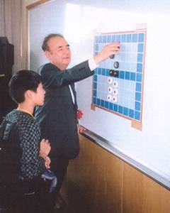 今回の第31回全日本オセロ選手権大会でも特別賞としてデラックスオセロ、2位にはグランドオセロ(新製品)が出ましたが、それを狙えるのは各部門とも決勝進出者のみです。小学生部門では、スイス方式(勝ち抜き戦方式)で全員6局打ち、3時からは、その上位8人による決勝トーナメントが始まります。残り36人はそこで終了で各自参加賞を貰って帰ることになるのですが、上記の経験を生かして、今回はその36人の小学生及びその保護者一同計70人位をあらかじめ用意してある別室に案内、本日の参加賞の新ゲーム・ソクラテスを紹介するパンフレットを70人全員に配布、大盤を使って、A.宇宙遊泳、D.ツースリーのルールを説明、「時間は4時迄取ってあります。“宇宙遊泳”だと1局20分位かかるでしょうし、それでは2〜3局しか打てません。今日は最も簡単な“ツースリー”(1局の所要時間はその名のごとく2分30秒!)を希望者全員と対局します。希望者はお父さん、お母さん方でもOKで、勝った人には記念品が用意してあります。」