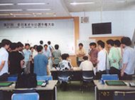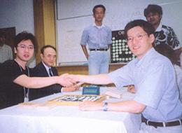 第24期名人戦(2003.3.22)で好成績(上はタイトル経験者のみ)を挙げた期待の両選手の力強い宣誓。その期待に応えて、全日本初優勝した後藤宏七段、秋の世界大会に向けて闘志は燃える!