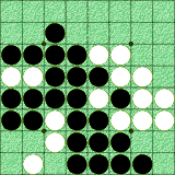 上図の時、既に白の時間は殆どなく、 を打ち、手際よく6個の黒石を返し終えたかに見えた時、対局時計のピーはピタリと止んで0表示!為則九段の負け確定(あと1秒あれば、33対31で白が勝っていた!)。