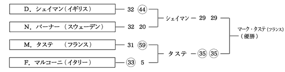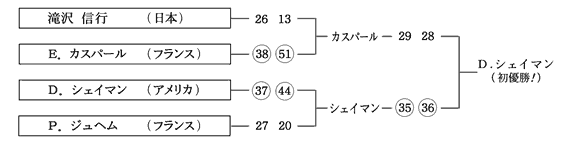 結局、ジュヘム、カスパールというフランス勢を準決勝、決勝で次々と破って、昨年の借り(決勝でフランスチャンピオン、M.タステに敗れた)を返して、3度目の正直でアメリカのD.シェイマンが待望の初優勝を果たしたのでした。
