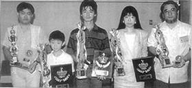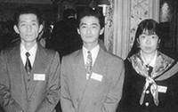 初めての団体戦で入賞(2位)して喜ぶ日本勢。左より、高橋忠男理事、滝沢信行、大柳真咲の3選手。