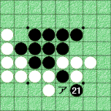 原図I、II、IIIはいずれも難解な局面ですが、そこで正解を打ってこそ世界チャンピオンへの道は開かれます。青木は上記の局面で3度共間違えました。尤も、カスパールも (4石損、正解は右辺A)、 (4石損、正解はウ)と悪手のお付き合いをしたので、黒に3度目のチャンス(原図III)が訪れたのですが、そこで又々間違えてからは黒勝のチャンスなし。