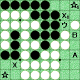 実戦は、その後黒優勢のまま終盤戦に入り、そのまま押し切るかと思われましたが、ゴールが見えた所で突然黒の歩調が乱れました。 は8石損の悪手(正解は1路上のA打ち)、続く も4石損の悪手(正解はX打ち)、それでも辛うじて2石残っていた黒(冨永)の強運!