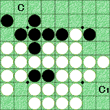 右下は奇数ですから、偶数理論はX打ちしてよいと教えていますが、大切なのはそのタイミングです。シェイマンの打ったX打ち は絶妙のタイミング!形勢は互角でこれからは力比べになりました。……。 (4石損。Cなら引き分け)、 (2石損、C1なら4石リード)、そして (22石損の大悪手。正解は左下X打ち)、すかさず (ブラックライン通しの絶好のX打ち!)と打たれて白アウト!最後は 〜 の黒の4連打が痛烈!