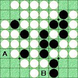 “中辺の横取り”、“X打ち”、“☆打ち”は好手にも悪手にも化けるオセロの三大変化(へんげ)です。実戦(1図) は、シェイマンが形に惚れて打った中辺の横取りですが、それが読みの裏づけのない変化(へんげ)なのを見破った中島の目はキラリと光りました。しかし、調和の中島は血気の中島ではありません。変化(へんげ)をすぐ攻めることはせず、まず自陣を固めのが先とA打ち !この悠揚(ゆうよう)迫らぬ堂々たる打ち方は流石第十世名人の貫禄です。