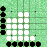3図は伊勢丹本店で行われたお客様(黒)対篠崎幸子五段(白)全日本女子チャンピオンとの対局の中盤戦。ここで篠崎五段の打った手は、ブラボーのX打ち!!(4図。なお『オセロ大観I』