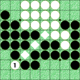 1図は三越本店で行われたお客様(白)対辻嘉一郎五段(黒)全日本チャンピオンの対局の中盤戦。ここで辻氏(黒)が打った手は絶妙手!!(2図)。以下白は全滅してしまいました。(『オセロ百戦百勝』